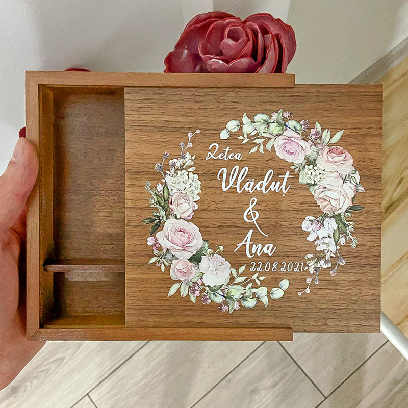 Am găsit soluția perfectă! Cutia cu două compartimente din lemn maro pentru stick și poze îți va aduce zâmbetul pe buze prin design-ul ei aparte, având un aer vintage care te va transpune peste ani și ani în ziua acelui eveniment.