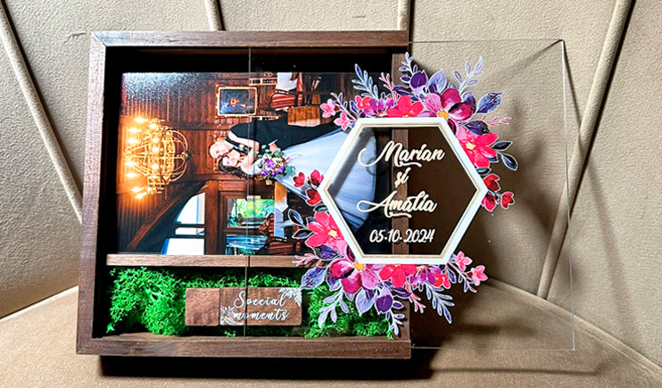 În momentul deschiderii cutiei, capacul glisant îți va scoate la iveală cele mai reprezentative poze din acea zi magică. Parcă ar fi o comoară!