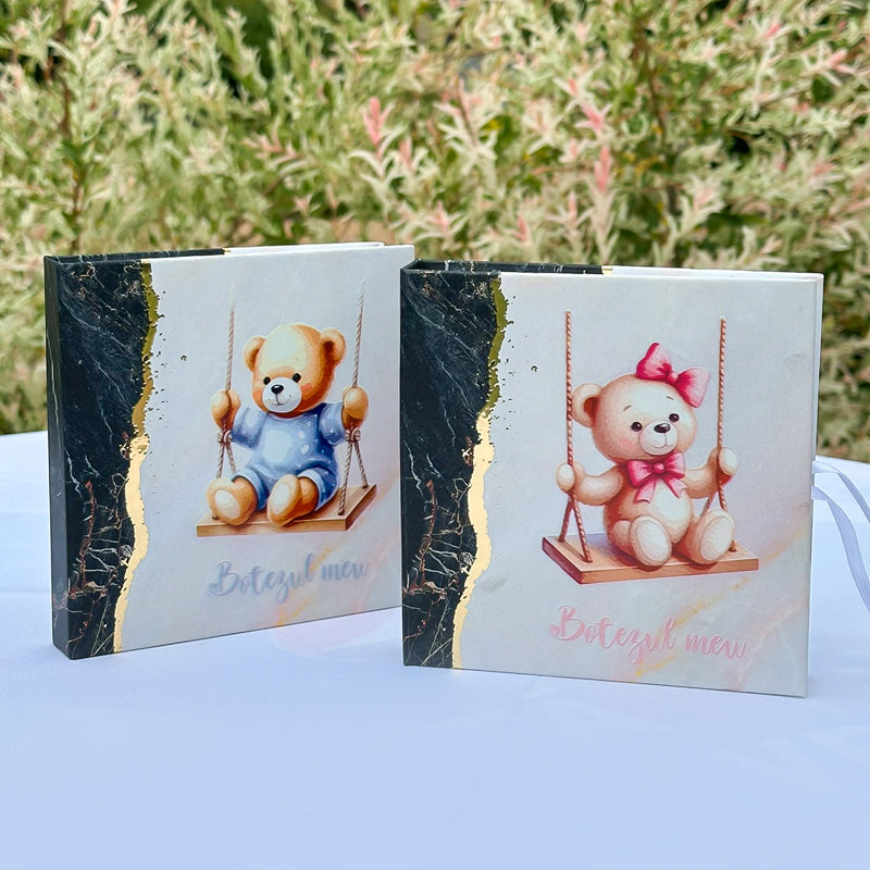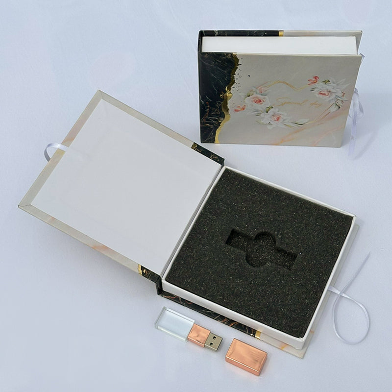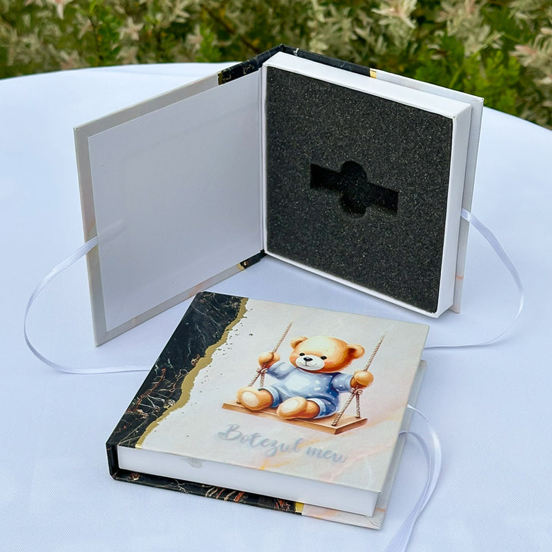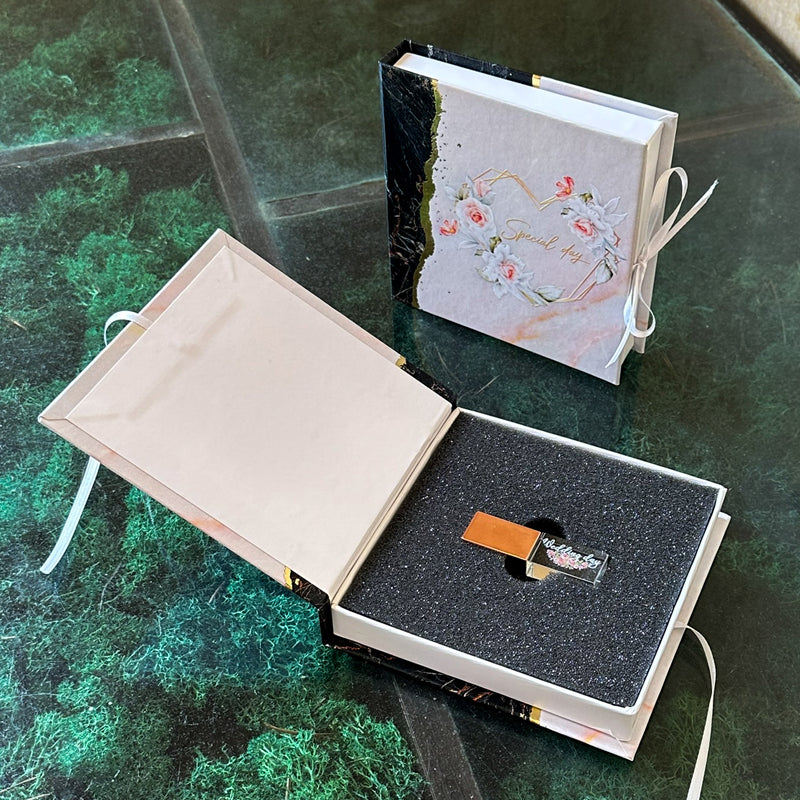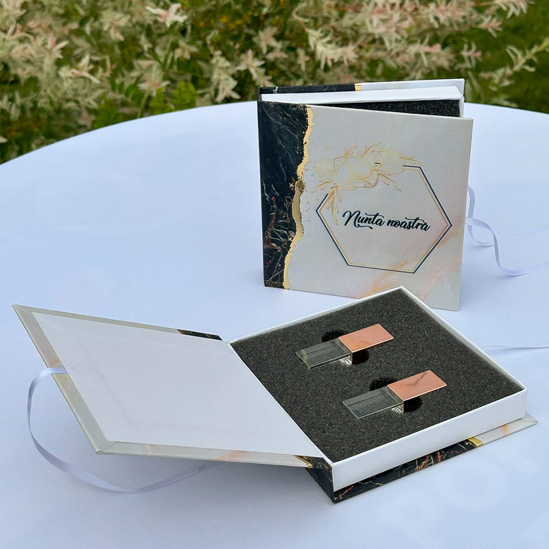 Cutia din carton pentru stick se deschide ca și o carte cu povești. Povestea lor. Fă și tu parte din ea și păstrează-le o amintire prețioasă pentru totdeauna :)